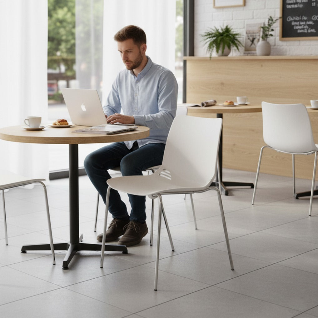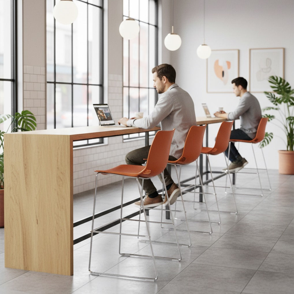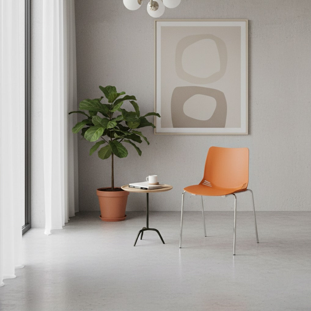 Race is characterized by its wide seat and geometric, contemporary shapes, making it an excellent choice for various environments. Available in two vibrant shades for the plastic monoshell, including gray, and orange.